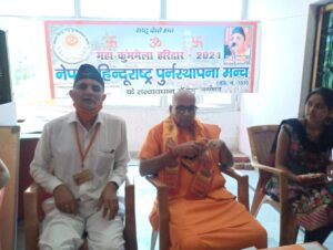उन्होंने बताया कि अखिल भारतीय अखाड़ा परिषद अध्यक्ष श्रीमहंत नरेंद्र गिरी सहित सभी तेरह अखाड़ों से वे संपर्क कर समर्थन की गुहार लगा चुके हैं। अखाड़ा परिषद अध्यक्ष सहित सभी अखाड़ों के श्रीमहंतों ने उन्हें समर्थन पत्र भी प्रदान किए हैं। अखाड़ों को नेपाल में रह रहे अपने संतों को नेपाल को हिंदू राष्ट्र के समर्थन में आवाज उठाने के लिए कहना चाहिए। साथ ही भारत सरकार के समक्ष भी इस मामले को उठाना चाहिए। बिष्णु प्रसाद बराल ने कहा कि नेपाल के सभी संत महापुरूषों को भी दलगत भावना से ऊपर उठकर नेपाल को हिन्दू राष्ट्र घोषित कराने में सहयोग करना चाहिए। इसी में प्राचीन हिंदू राष्ट्र नेपाल के आम जनमानस की भलाई है। नेपाल को पुनः हिन्दू राष्ट्र घोषित किए जाने का समर्थन करते हुए हिन्दू रक्षा सेना के राष्ट्रीय अध्यक्ष महामण्डलेश्वर स्वामी प्रबोधानन्द गिरी महाराज ने कहा कि संत समाज व सभी हिंदू संगठन नेपाल को आज भी हिन्दू राष्ट्र ही मानते है। सनातन संस्कृति को नष्ट करने के लिए चलाए जा रहे विश्वव्यापी षड़यंत्र के तहत नेपाल को धर्मनिरपेक्ष राष्ट्र घोषित किया गया है। स्वामी प्रबोधानंद गिरी ने कहा कि नेपाल सरकार तत्काल सार्वजनिक रूप से नेपाल को दोबारा हिन्दू राष्ट्र घोषित करे। हिन्दुओं का संरक्षण संवर्द्धन करे तथा धर्म परिवर्तन पर कड़ाई से रोक लगाए। उन्होंने कहा कि यदि नेपाल सरकार जल्द से जल्द नेपाल को हिन्दू राष्ट्र घोषित नहीं करती है तो हिन्दू रक्षा सेना नेपाल कूच करेगी और बड़े स्तर पर आंदोलन करेगी। इस दौरान बल बहादुर, राम यादव, आरोही राणा आदि भी मौजूद रहे।
