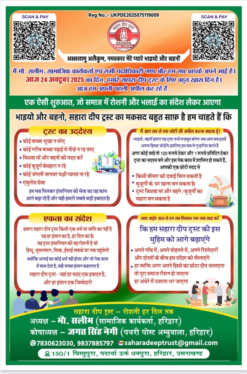 “सहारा दीप ट्रस्ट”: रोशनी हर दिल तक/हरिद्वार की पवित्र भूमि से आज एक नई सामाजिक पहल की शुरुआत